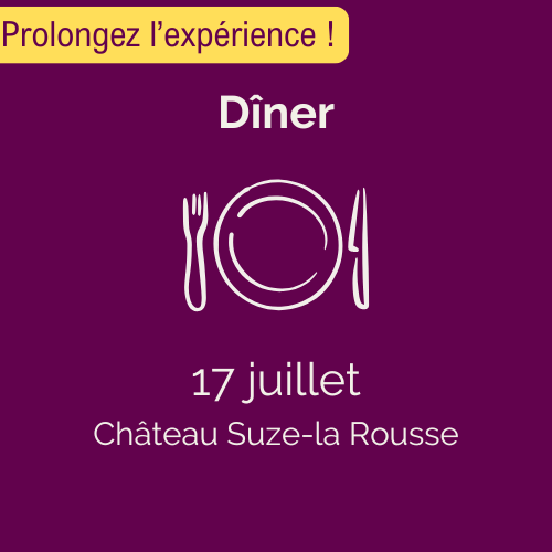 Afficher le planUniquement sur réservation avant le 10 juillet Proposé par le traiteur Paprika. Repas servi dans les jardins du château de Suze la Rousse de 19h à 20h30